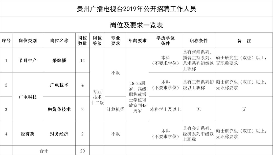 贵州广播电视台招聘20名事业编制工作人员