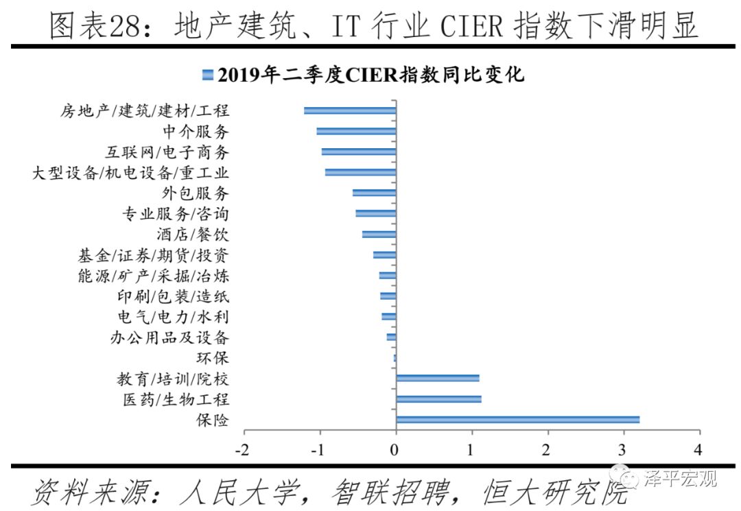 分行业看,制造业就业主要受出口低迷和PPI下行企业盈利下滑影响,建筑业受基建回升空间有限和房地产投资下滑影响,后续均不乐观;从智联招聘数据看,金融业招聘需求受金融监管影响一、二季度分别同比减少39.7%、37.0%,互联网/电子商务分别同比减少22.5%、13.6%。