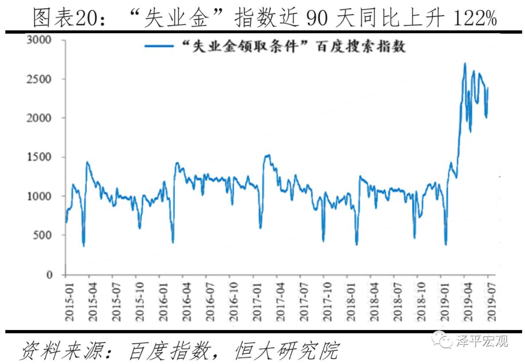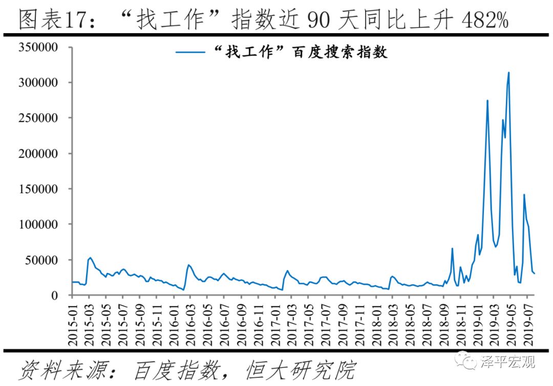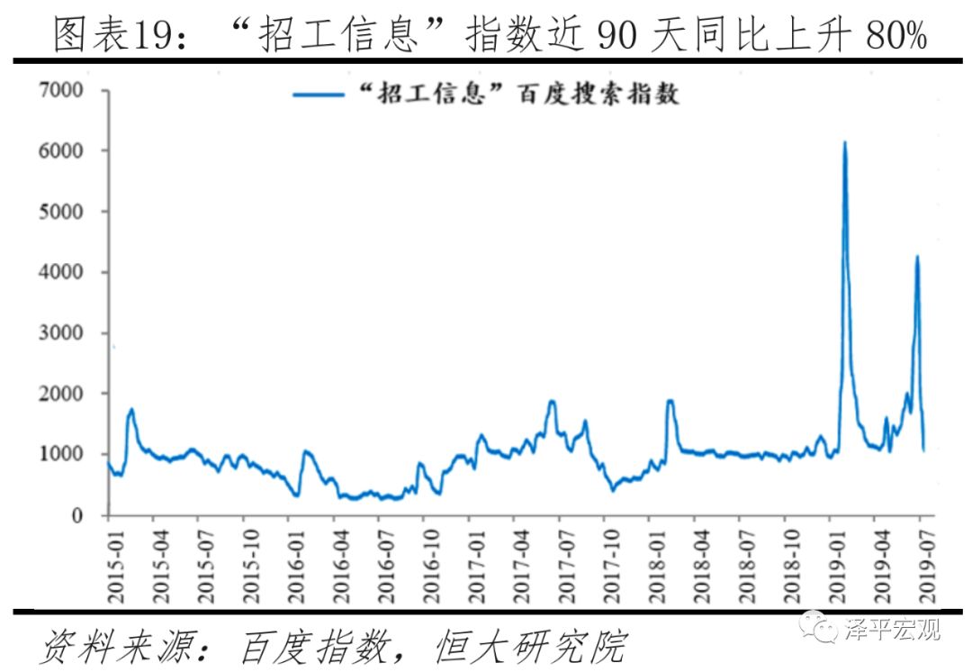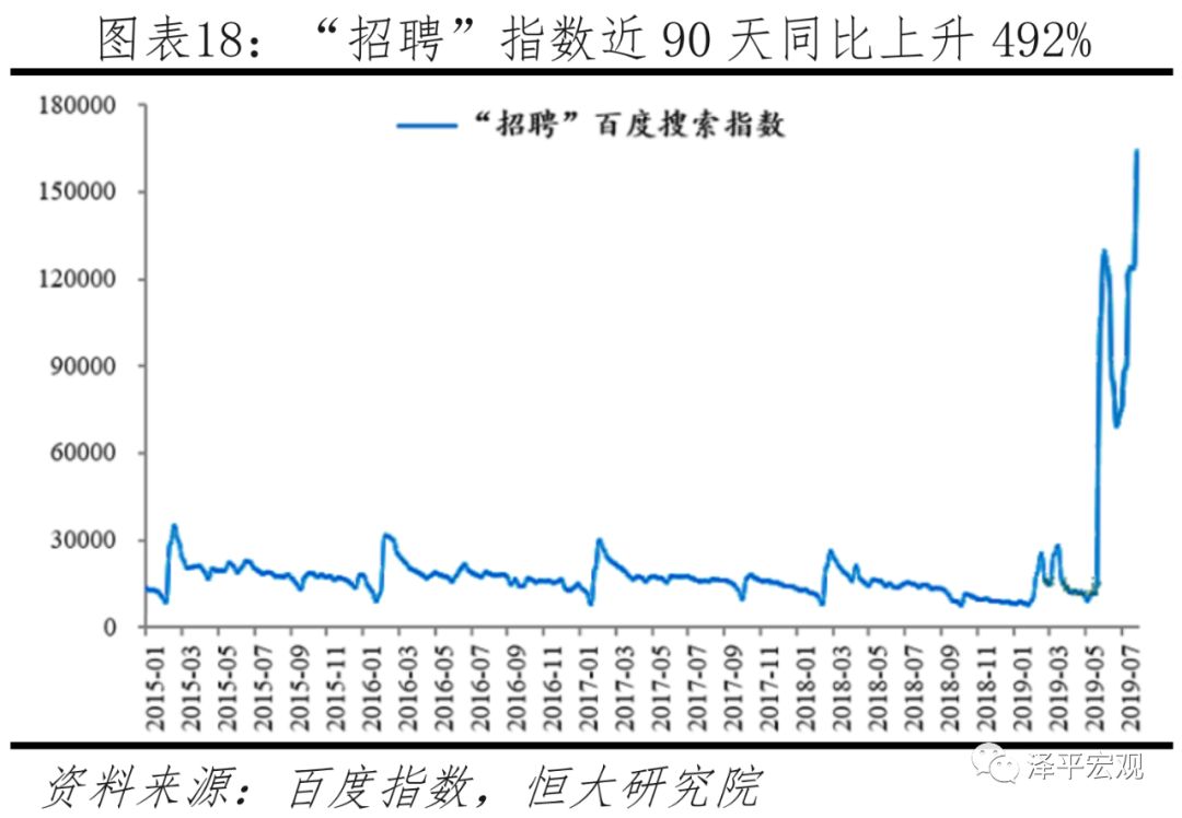 3)“招工信息”:“招工信息”可用于代表蓝领工人的求职需求,2019年春节后的峰值是2015-2018年的近30倍,蓝领、农民工群体的失业问题强于往年。7月以来,该指数经历了年内第二个小高峰,近90天日均值同比上升80%。