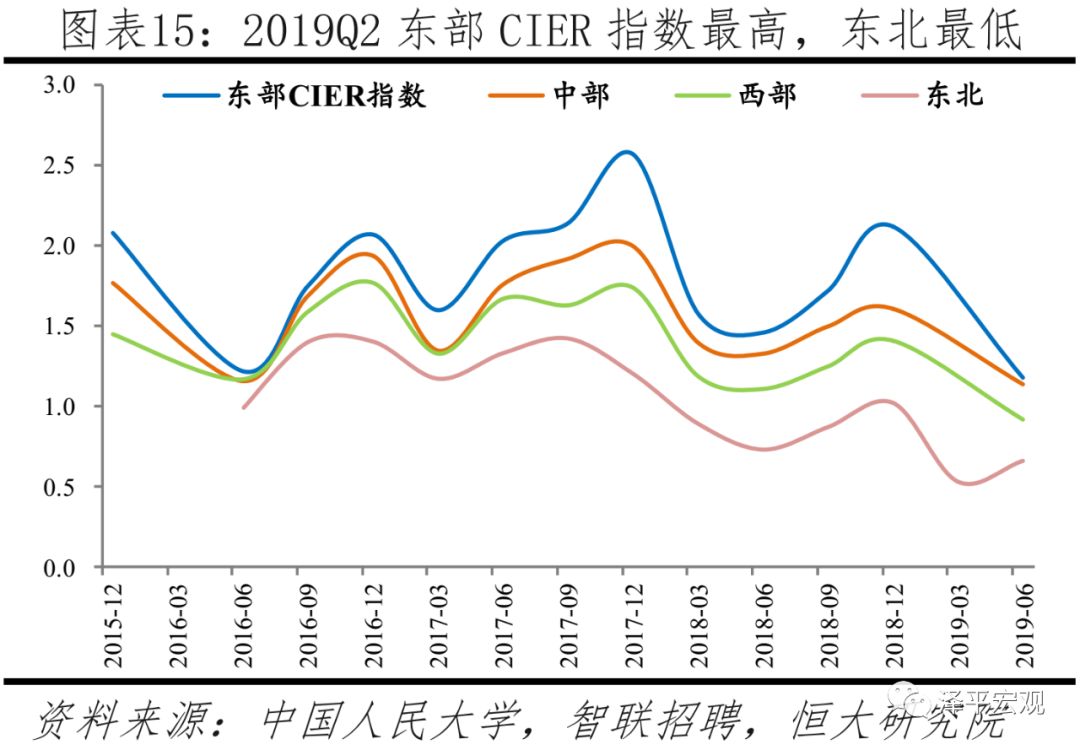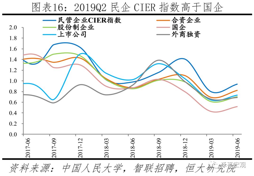 分区域看,2019年二季度东部、中部、西部和东北的CIER指数分别为1.18、1.14、0.92、0.66,同比均有所下滑,且东部地区下滑最大;分线城市看,一线、新一线、二线、三线城市CIER指数分别为0.60、0.94、1.18、1.25,二线和三线城市下滑最大;分企业性质看,2019年二季度民企、国企CIER指数分别为0.94、0.52,同比也呈下滑趋势。