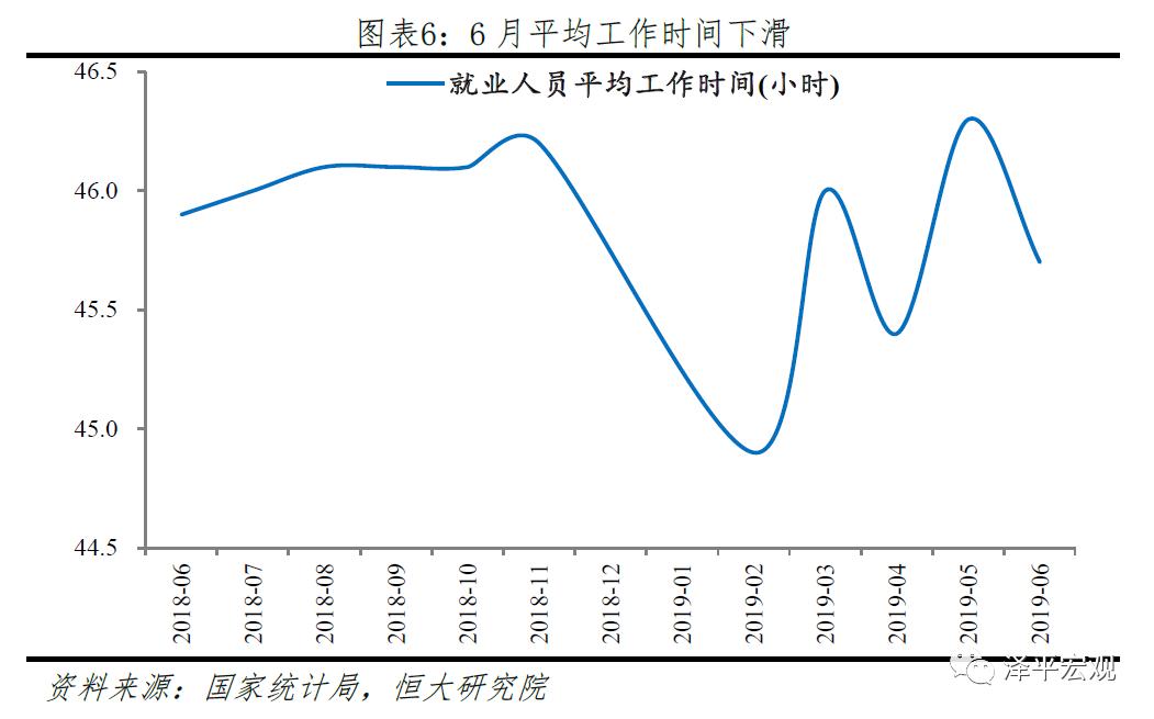 从制造业PMI从业人员指数来看,2017年3月以后制造业PMI从业人员指数连续27个月低于50%;2019年6月降至46.9%,连续3个月下滑,环比、同比分别下滑0.1、2.1个百分点。其中,大型、中型、小型企业制造业PMI从业人员指数均从2018年下半年开始下滑,2019年6月分别为47.0%、45.9%、48.3%,同比分别下滑2.0、2.4、1.9个百分点,中型企业不仅绝对水平更低并且下滑幅度更大。