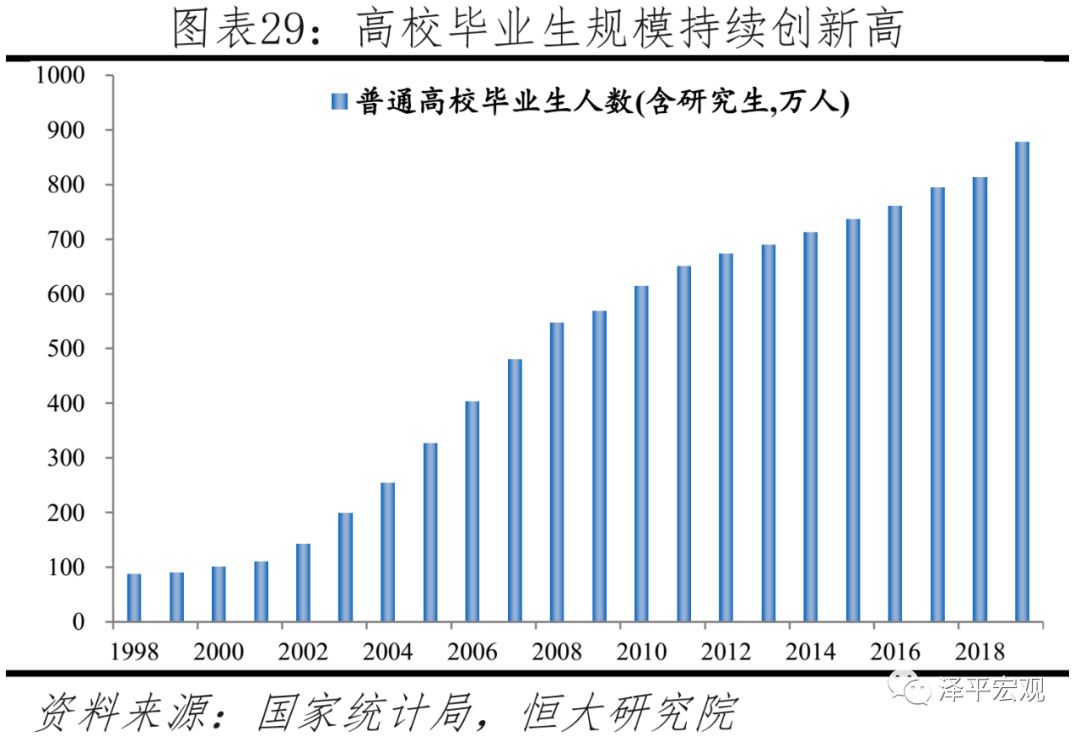 在高校毕业生方面,普通高校毕业生人数(含研究生)从1999年的88万攀升至2019年的834万。考虑到2015-2018年普通高校招生人数(含研究生)从803万增至877万,未来几年高校毕业生规模仍将持续创新高。由于部分学生的技能难以适应就业要求,“就业难”的压力持续上升。