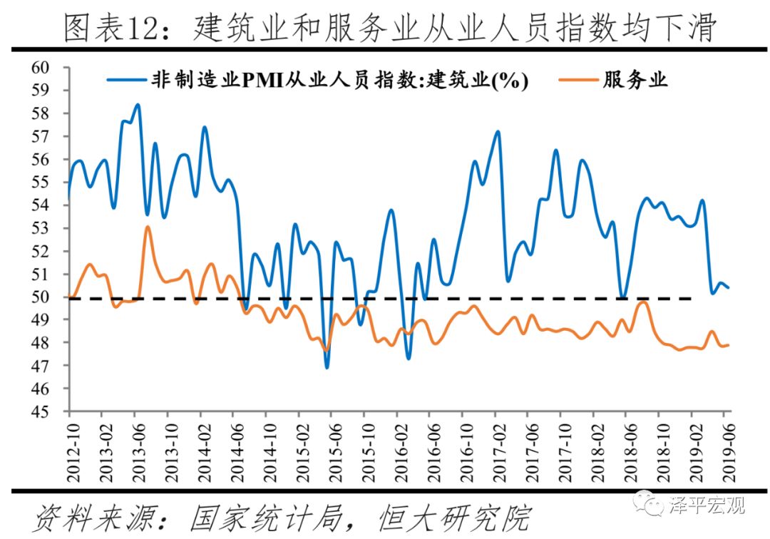 从非制造业PMI从业人员指数来看,2018年9月非制造业PMI从业人员指数开始持续低于50%,2019年6月降至48.2%,连续2个月下滑,环比、同比分别下滑0.1、0.7个百分点。其中,建筑业PMI从业人员指数从2019年3月的54.1%开始迅速下滑,2019年6月降至50.4%。服务业PMI从业人员指数2014年7月后持续低于50%,2018年8月从49.7%开始迅速下滑,2019年6月降至47.9%。