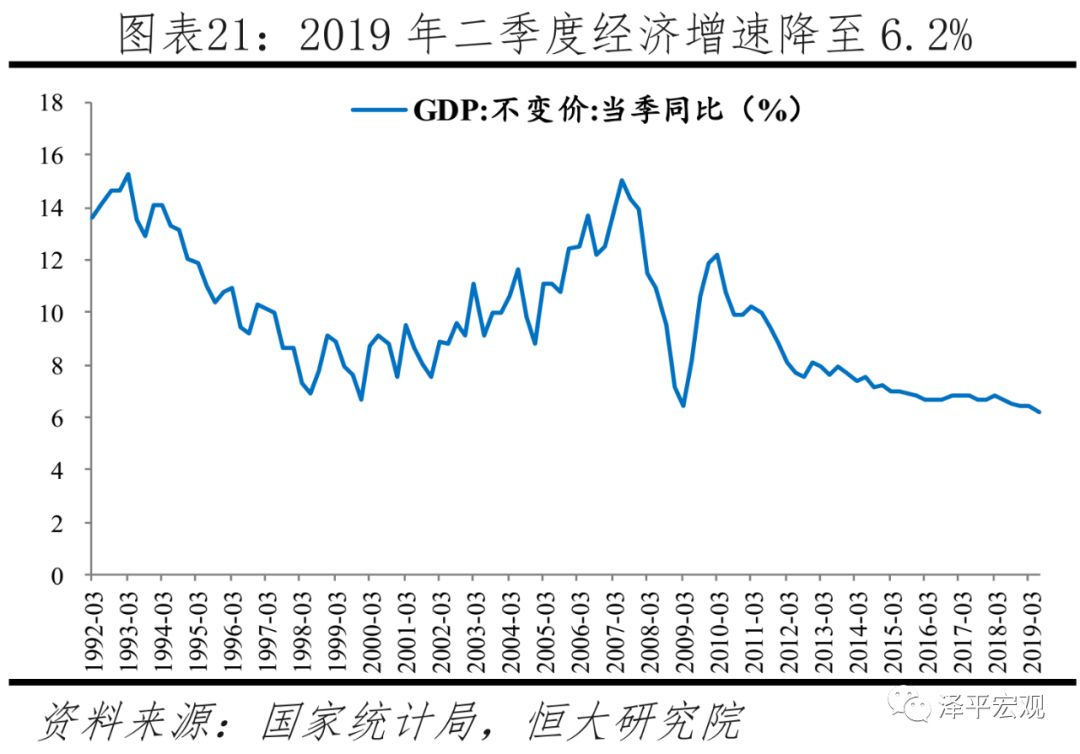 当前经济金融形势严峻,2019年二季度GDP增速降至6.2%的新低,比一季度下降0.2个百分点,而且5月贸易战再度升级、房地产融资收紧政策密集出台等影响尚未显现。近期经济先行指标纷纷下滑,比如房地产销售、土地购置和资金来源回落,PMI订单和PMI出口订单下滑。而且经济金融结构正在趋于恶化,比如,企业中长期贷款占比下降,短贷、短融占比上升;PPI下行,企业盈利下滑。2019年二季度GDP实际增速6.2%,在一季度短暂企稳后,较去年四季度和今年一季度下滑0.2个百分点,为1992年实施GDP季度核算以来的最低点,后将再下台阶。