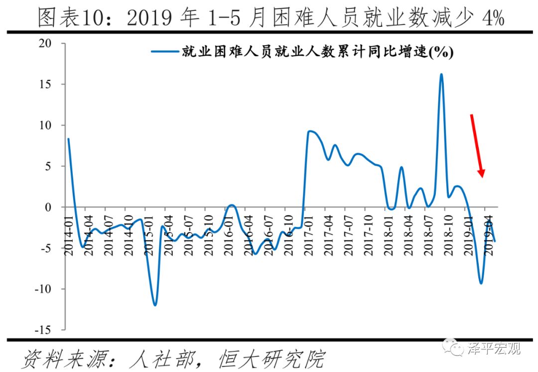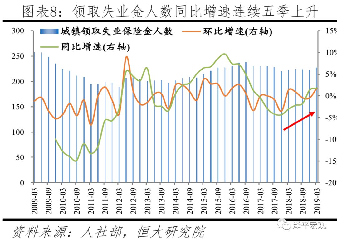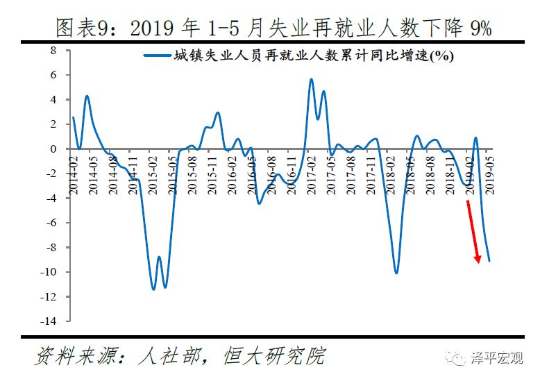1)城镇新增就业上半年同比减少2%,领取失业金人数、再就业人数增速均不乐观。2019年上半年城镇新增就业仅747万人,同比减少2.0%,目标完成率降至67.0%,比去年上半年降低1.4个百分点。2019年一季度领取失业保险金人数同比增速已连续五个季度上升,城镇失业人员再就业人数2019年1-5月同比减少9.1%,就业困难人员就业人数同比减少4.2%。