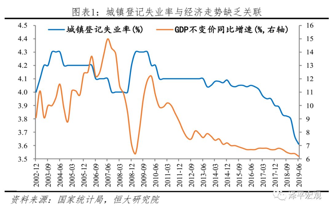 1)城镇登记失业率依赖失业者主动前往人社部门登记,且只针对非农人口,数据波动小,2019年二季度降至3.61%,与经济走势缺乏关联。1980年代初,中国开始建立登记失业制度,当时称“待业统计”,1994年才改为“登记失业”。城镇登记失业率=城镇登记失业人员/(城镇从业人员+城镇登记失业人员)。城镇登记失业人员是有非农业户口、16周岁以上至退休年龄内、有劳动能力、无业而要求就业,且自愿主动前往公共就业服务机构进行登记的失业者。显然,登记失业人员不包括农民工等外来常住人口,难以反映真实失业情况。从数据看,2002-2016年城镇登记失业率长期稳定在4.0%-4.3%之间,2017年开始持续下降至2019年6月的3.61%,这与经济增长趋势明显不符。