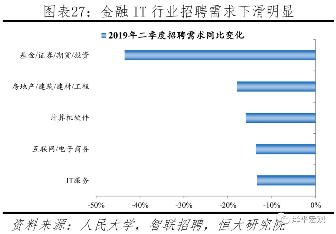 3)金融业、IT业。根据智联招聘数据,2019年一、二季度金融业招聘需求分别同比减少39.7%、37.0%,在金融严监管态势下需求萎缩尤为突出;互联网/电子商务招聘需求分别同比减少22.5%、13.6%。此外,二季度房地产/建筑/建材/工程、计算机软件招聘需求分别同比下降15.9%、13.9%。
