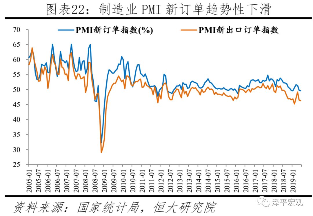 经济再下台阶的主要原因是:短周期库存复苏受到金融杠杆周期下半场的压制、中美贸易摩擦冲击出口效应显现、房地产调控持续收紧导致的地产投资拐点出现。虽然专项债发行发力,但土地财政收入出现下滑,预计基建反弹力度有限,难以对冲经济下行走势。从6月数据看,尽管消费投资等经济指标有所企稳但依旧低迷,并且先行指标纷纷下滑。其中,PMI新订单指数6月为49.6%,较上月回落0.2个百分点;房地产销售6月同比为-2.2%,降幅较上月缩窄3.3个百分点,但仍是负增长,并且近期银保监会、发改委等部门全面收紧银行贷款、信托、海外债等主要融资渠道,下半年房地产融资形势严峻;新增企业中长期贷款6月为3753亿元,同比减少248亿元,企业中长期贷款占比低位波动,贷款结构恶化,金融机构对企业不信任感增强。(参见恒大研究院7月报告《生于忧患——2019年中期宏观展望》、《充分估计当前经济金融形势的严峻性——全面解读6月经济金融数据》)
