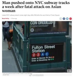▲据美国中文网报道,当地时间23日,美国纽约市再次发生一起地铁乘客被推下铁轨的事件,造成该名乘客受轻伤。警方称,受害者是一名61岁男性,他被推下铁轨后仍可自行爬上站台,没有与列车发生接触。推人的嫌犯是一名20多岁男子,犯案后立即逃离了现场。而大约一周前,一名亚裔女子也在地铁站被推下铁轨,后遭撞击身亡。