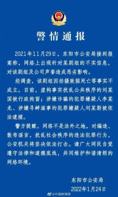 ▲浙江东阳市公安局24日发通报称:2021年11月29日,东阳市公安局接到报案称,网络上出现针对某剧组的不实信息,对该剧组及公司声誉造成恶劣影响。经调查,该剧组因拍摄致猫死亡等事实不成立。目前,虚构事实扰乱公共秩序的刘某国被行政拘留;涉嫌诈骗的犯罪嫌疑人李某龙、涉嫌寻衅滋事的犯罪嫌疑人刘某斯被依法逮捕。