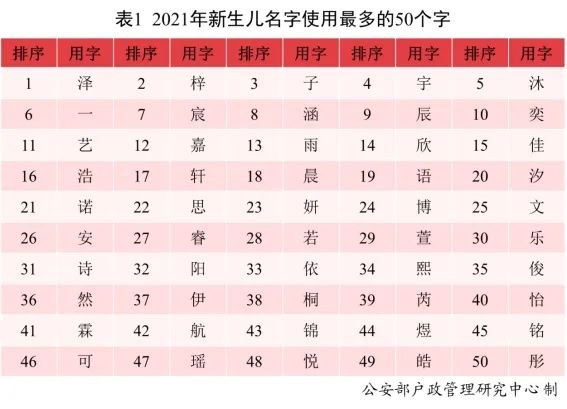 ▲公安部24日发布《二〇二一年全国姓名报告》,报告显示,2021年出生并已经进行户籍登记的男女新生儿中,使用频率最高的名字分别是“沐宸”和“若汐”。使用频率最高的50个字依次为泽、梓、子、宇、沐等。