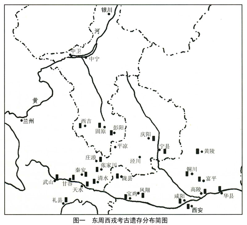 从目前所累积的西戎考古材料来看,西戎文化遗存主要分布在宁夏回族自治区南部、甘肃中东部和南部以及关中大部,东不过潼关,西到渭河上游,南不越秦岭,北至宁夏固原一带,涉及宁夏回族自治区西吉县、固原市、彭阳县,甘肃省武山县、甘谷县、天水市、秦安县、庄浪县、清水县、张家川回族自治县、平凉市、庆阳市、泾川县、宁县,陕西省陇县、凤翔县、宝鸡市、咸阳市、西安市、铜川市、富平县、高陵县、华县、黄陵县等三省的二十多个县市,遗址点在50处以上。在这一大片区域中,陇山东西两侧是其中心分布区(图一)。