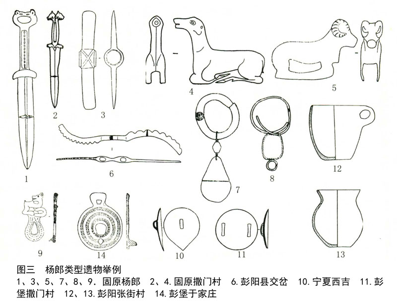 除甘肃庆阳地区发现的一座墓葬外,杨郎类型遗存集中分布在宁夏固原地区,遗存延续的时代较长,从春秋晚期一直延续到战国晚期,其中绝大部分墓葬的年代主要集中在春秋晚期至战国早期,只有杨郎墓群中有一小部分墓葬的年代进入了战国晚期。