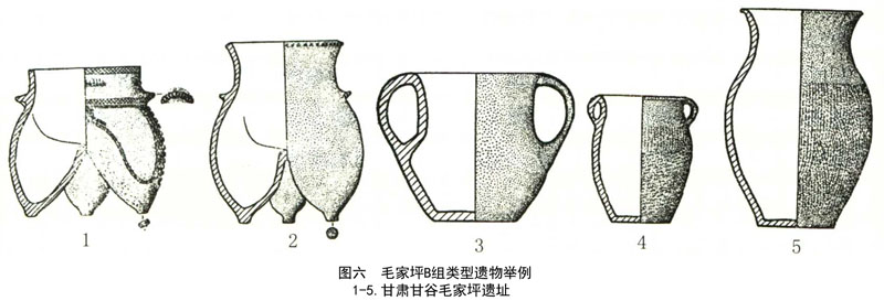 毛家坪B组遗存的遗迹主要为鬲棺葬,均掩埋婴孩骨骼。遗物仅见陶器,包括柱足鬲、铲足鬲、高领深腹罐、双耳平口罐、双大耳罐(图六)。陶质多为夹砂红褐陶,器表色泽不匀,红、灰、黑相杂。多见素面,绳纹较少,绳纹浅而细,竖向整齐。毛家坪B组遗存目前经过科学发掘的仅毛家坪遗址一处,但与毛家坪B组遗存陶器形态相同或相似者,在渭河流域的甘谷、武山、天水等地多有发现,一些县市博物馆中类似的藏品数量很多。因此,这里暂将其称之为“毛家坪B组类型”。