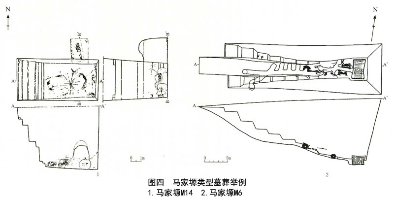 马家塬类型的墓葬形制主要有两大类:偏洞室墓和竖穴土坑墓。偏洞室墓是马家塬类型的典型墓式,在马家塬战国墓地已经发掘的25座墓葬中,24座是偏洞室墓,而宁夏西吉陈阳川墓地发掘的三座墓葬均为偏洞室墓;竖穴土坑墓在马家塬类型中也有发现,马家塬墓地M6为戎王一级的墓葬,墓葬形制为带斜坡(中间)加阶梯(两侧)式墓道的竖穴土坑木椁墓,这种墓葬形制不见于其他地点,其特殊性可能是高等级墓葬的一种特殊形制(图四)。在甘肃清水刘坪墓地清理的一座被盗墓葬也为土坑墓,两端有龛,在这座墓葬周围有小型墓葬十几座,由于被盗且未发掘,墓葬形制尚不清楚。