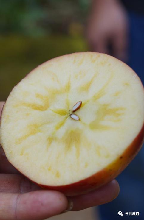 将苹果对半切开,可以看到满满的冰糖心,尝上一口,酸甜适中,细脆津纯,且果肉硬度大,纤维少,质地细,果汁含量、糖份含量高。