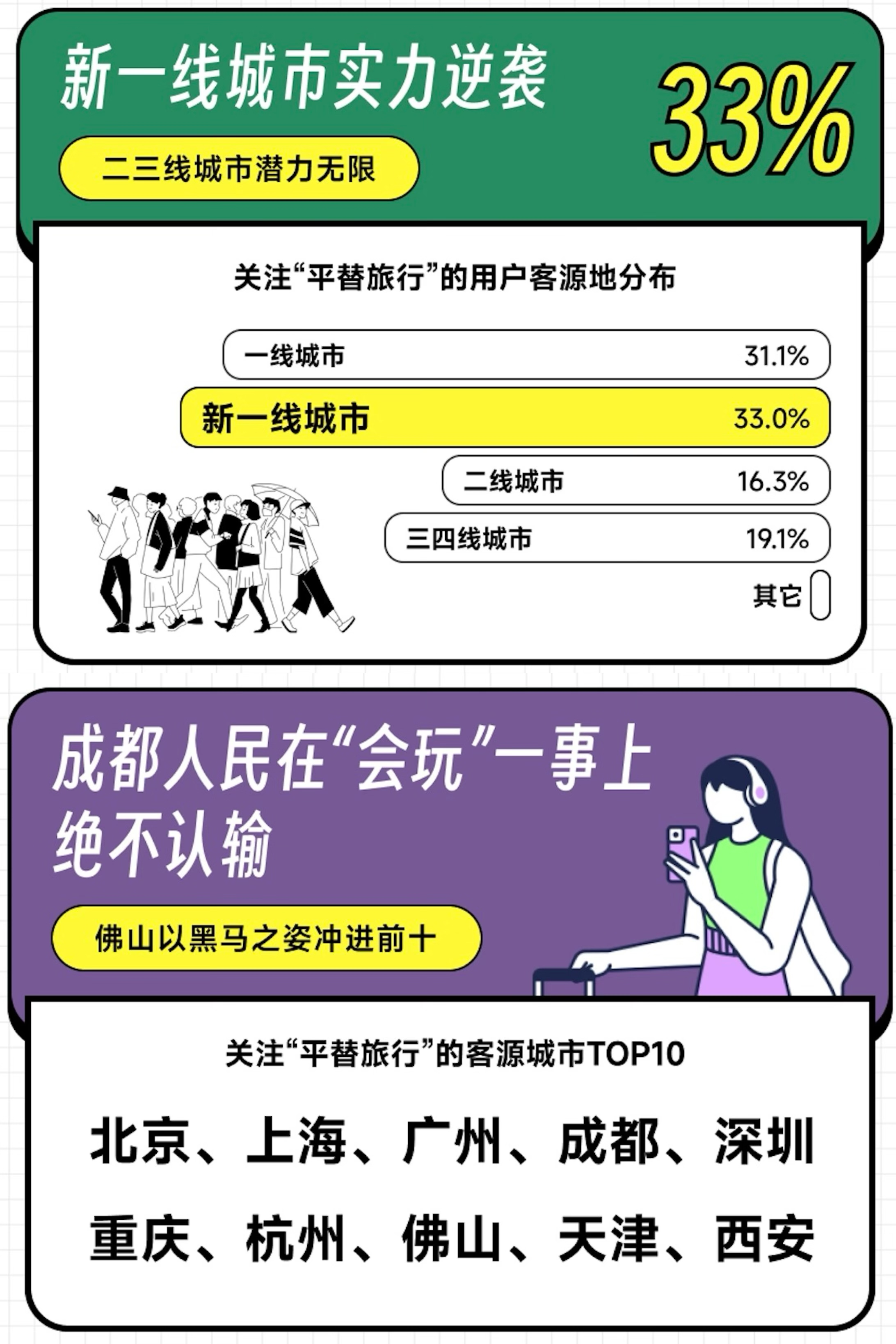 值得关注的是,新一线城市在“平替旅行”客源地中以33%的占比实力逆袭,成都在关注“平替旅行”的客源城市榜单中仅次于北京、上海、广州位居第四,重庆、杭州、天津、西安同样进入前十。工作压力相较于大城市更小的二三线城市表现突出,广东佛山以黑马之姿成为唯一上榜的二线城市。