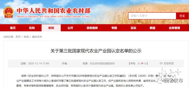 12月14日,农业农村部发展规划司公示第三批国家现代农业产业园认定名单。经产业园所在地人民政府申请、省级农业农村和财政部门审核推荐、专家评审和现场核查等程序,农业农村部、财政部拟认定广东省茂名市现代农业产业园等38个国家现代农业产业园。