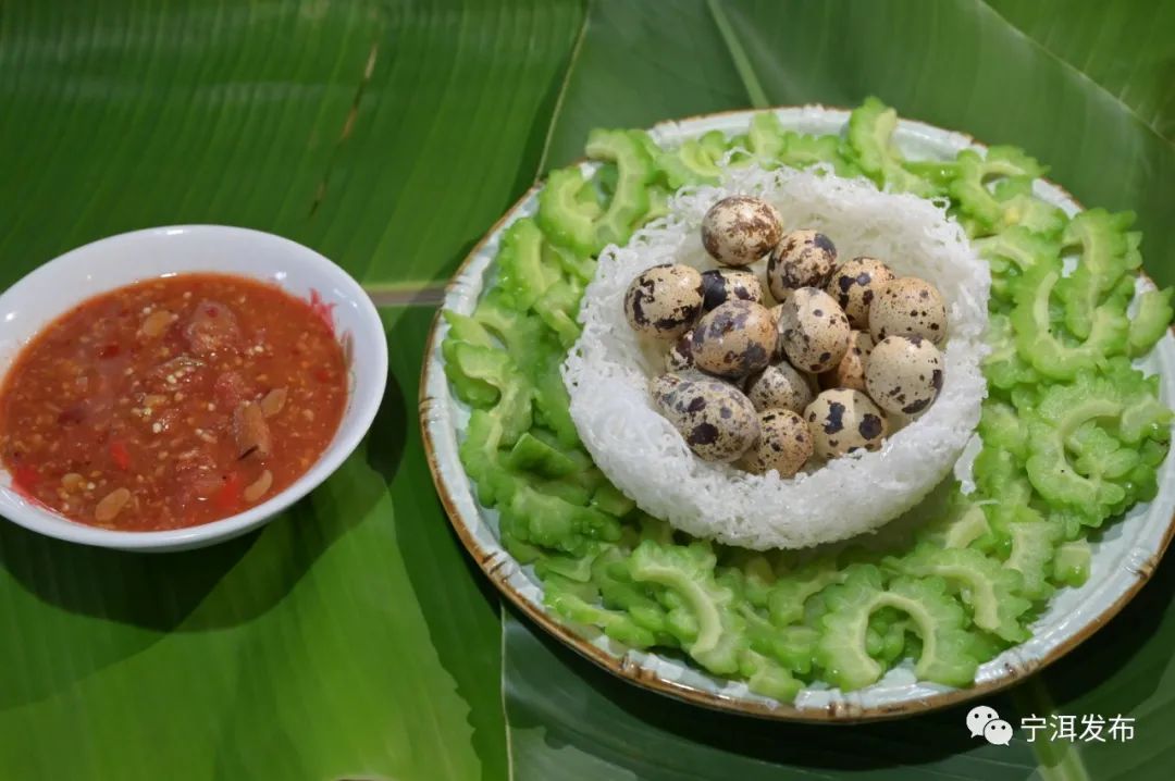 鹌鹑蛋代替斑鸠蛋,用油炸粉丝做窝,煮熟的凉苦瓜配料,搭上番茄水豆豉酱。苦瓜作菜,因为马帮的生活是苦的。