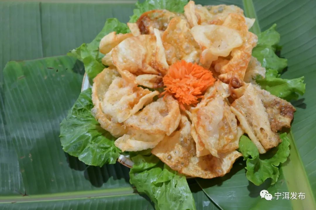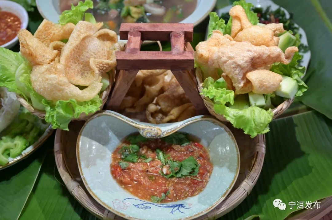 猪皮油炸,配上生菜,摆放在有马鞍模型的竹盘上,与傣族辣咪相配。