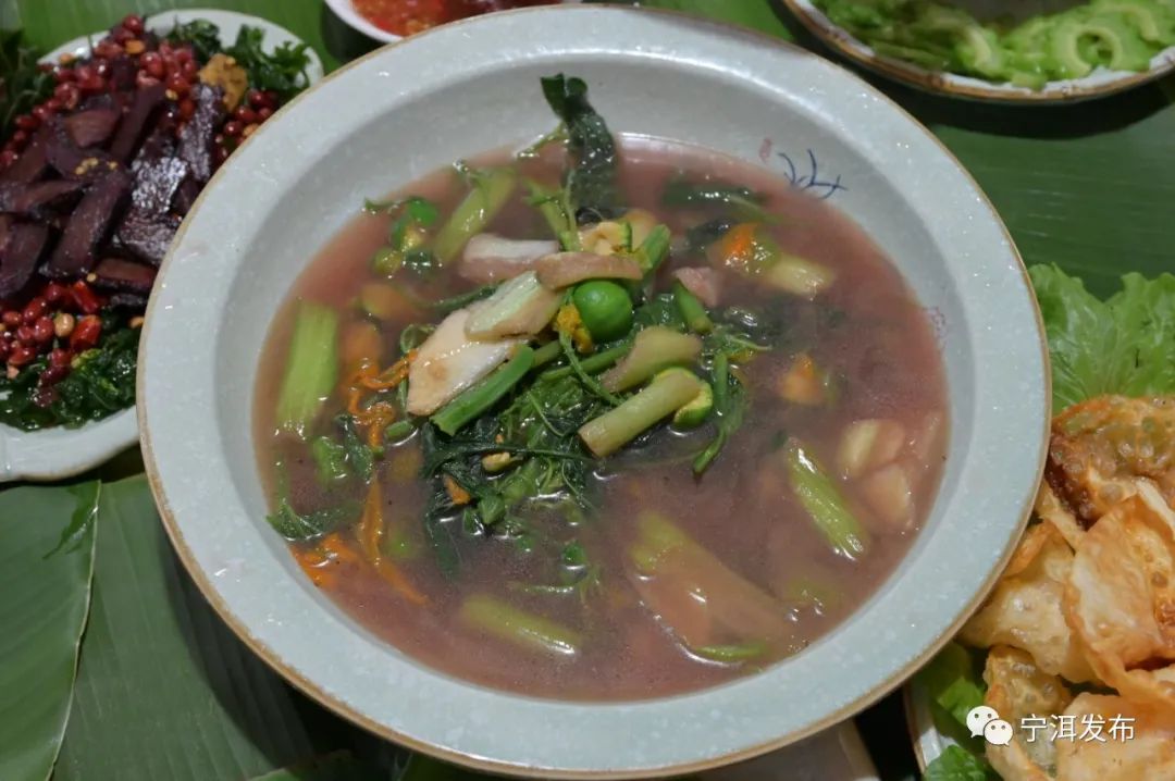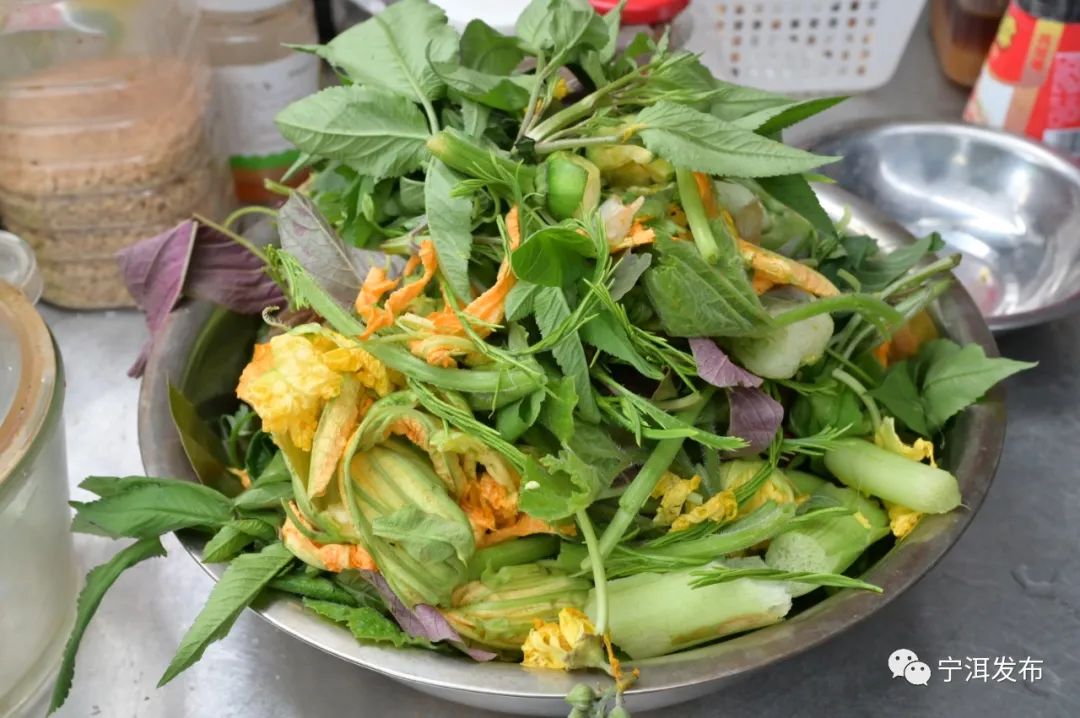 小面瓜、叉叉草、水芋等一锅煮,菜汤野气十足,滋味不寻常。