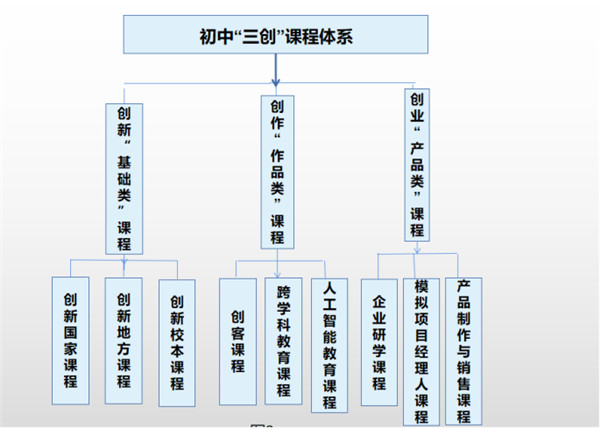 以“育人和提高初中生适应未来的创新素养”为目标,首创了指向未来、强化社会责任和社会实践能力的“三创”课程体系。“三创”课程体系包括:创新“基础类”课程、创作“作品类”课程、创业“产品类”课程。