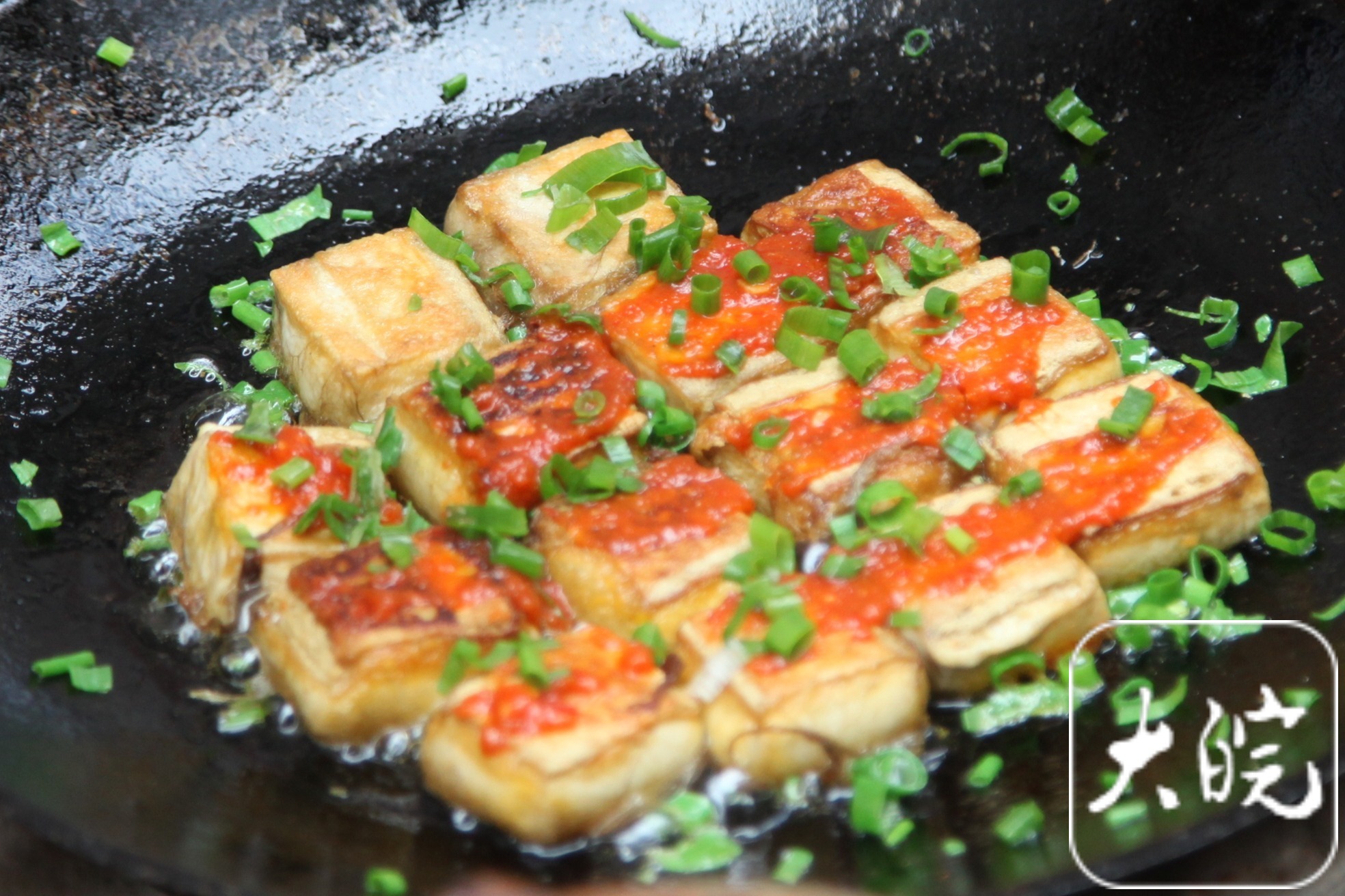 上好的毛豆腐上一层浓密纯净的白毛,上面均匀分布有一些黑色颗粒,这是孢子,也是毛豆腐成熟的标志。用油煎后,佐以葱、姜、糖、盐及肉清汤、酱油等烩烧而成。上桌时以辣椒酱佐食,鲜醇爽口,芳香诱人,并且有开胃作用,为徽州地区特殊风味菜。
