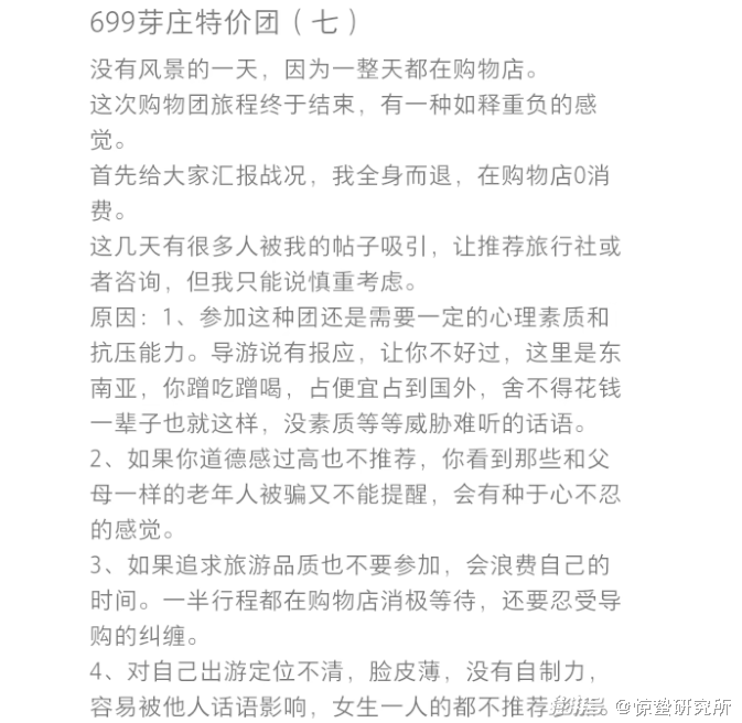 “还算好的是,的确没有强制性消费,不过我们或多或少也被推销员抱怨是吝啬鬼”,小文告诉惊蛰研究所,“感觉对于老年人来说,是个消遣时间的方式,但对于以旅游为目的的年轻人来说,是真的很难熬,听课很无聊很困,中午又没有休息时间,当地导游还会在车上疯狂推销产品”。