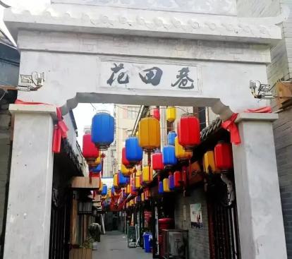 巷子门口是青石拱门,正上端刻写着“花田巷”三字牌坊,巷子曲折,在门口能看到的只是很少一部分,拐进去才能看到热闹繁华的美食街。进了大门,空中悬挂的红黄蓝灯笼整齐划一,一直延伸到尽头。巷子的墙面是用青石铺成,墙上刻画着各式各样的风筝,京剧人物等。门口人力车的雕塑似乎在招呼过往的游客,街道两边火红的灯笼充满了温馨气息,花色迥异的木窗与浪漫别致的花卉相得益彰。