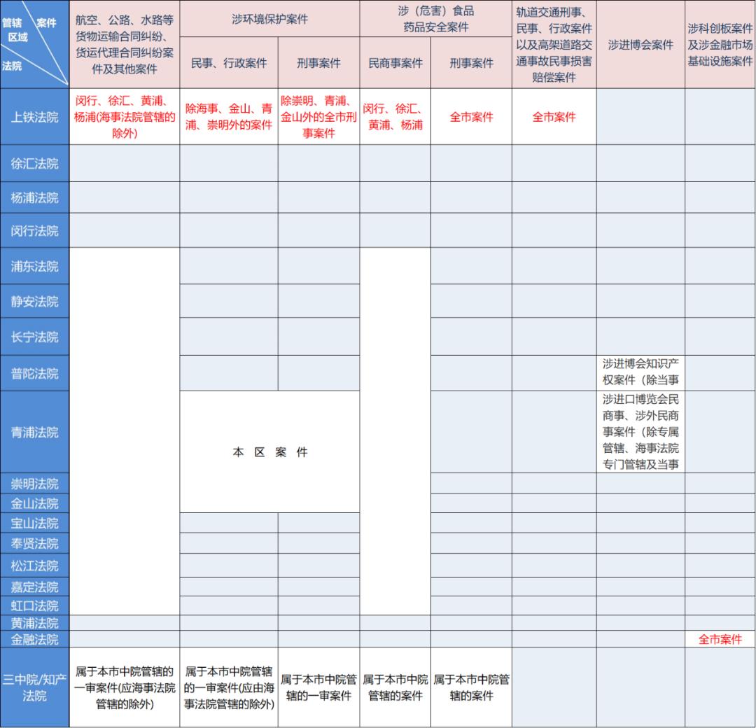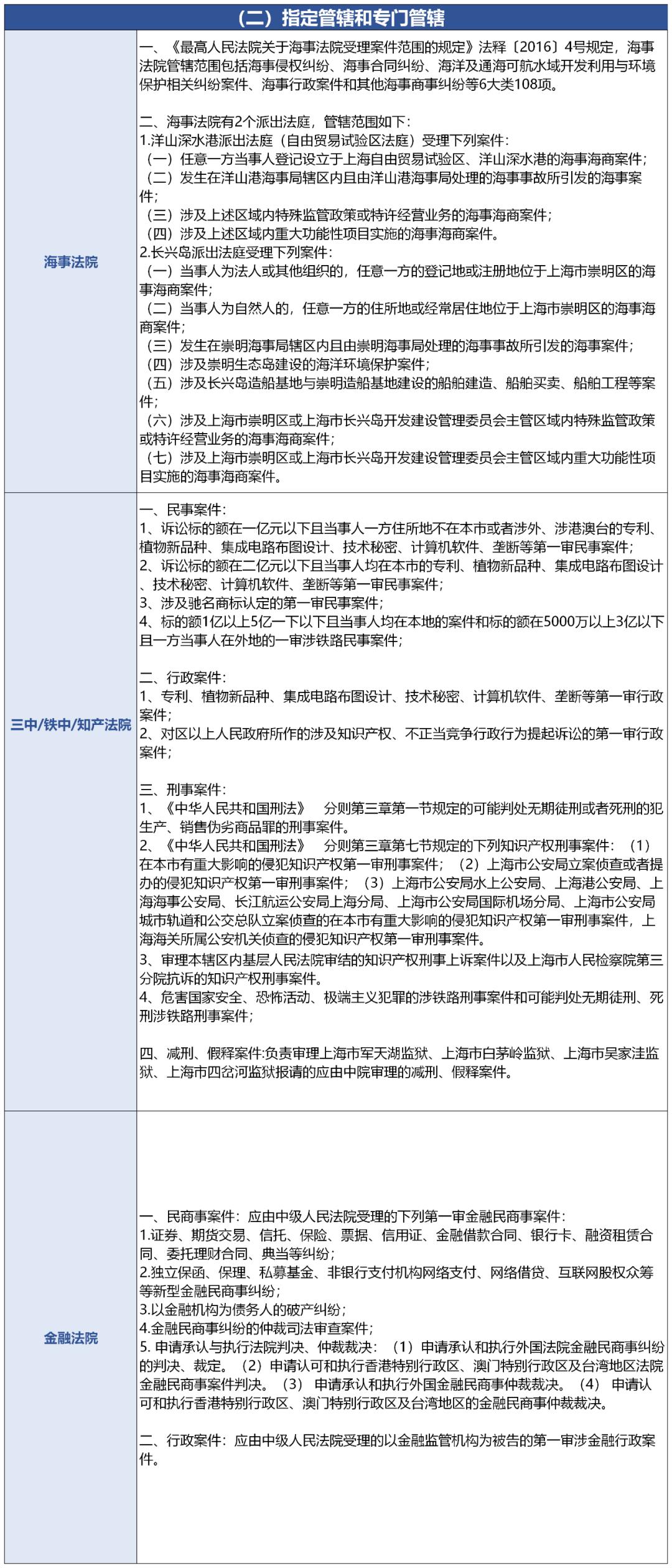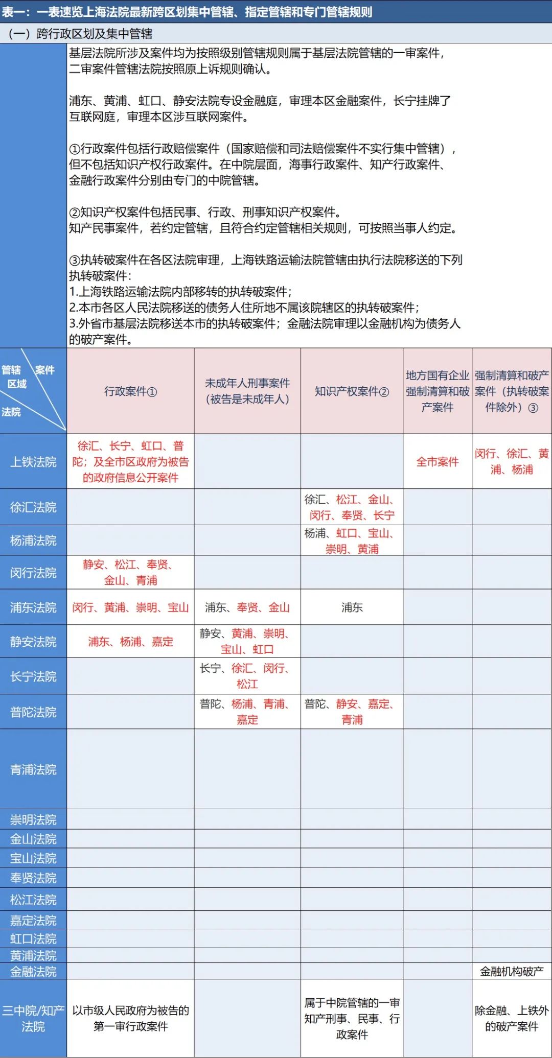 表一:《一表速览上海法院最新跨区划集中管辖、指定管辖和专门管辖规则》