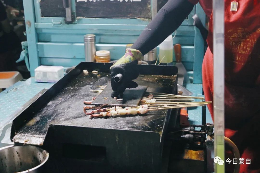 他们家是夜市人气最高的铁板鱿鱼,鱿鱼放置在铁板上,再淋上芝麻酱、葱、等小料,一气呵成。鱿鱼配上这些香辣调料,味道能飘出几十条街。