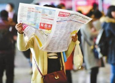 2月28日,成都春季特大型招聘会现场,求职者拿着报纸找工作。