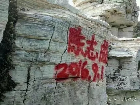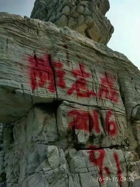 9月15日,网友zhdq在某公众号平台,发布4张北京醉石林被喷上红色涂料的照片。照片显示,醉石林的景观石上被喷上了“陈志成2016.9.1”、“沧海桑田掀巨变,造就嶙峋乱石山”等字样。这些字的落款都有“陈志成”仨字。该网友还表示,“陈志成”还在金祖山、孤山口、火焰山等十余处景区进行了涂鸦,并呼吁市民共同寻找该人,有奖征求线索。