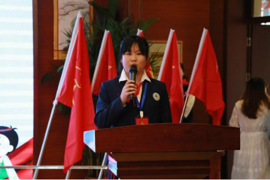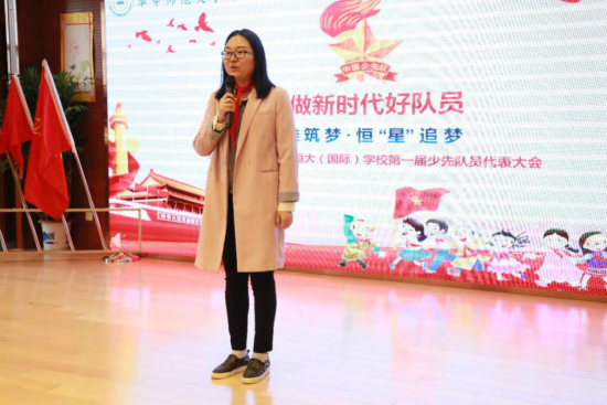 华师附属恒大(国际)学校少工委主任朱莉致辞,她代表少工委对全体少先队员表示祝贺,向为学校少先队工作付出辛勤汗水的少先队工作者们表示崇高的敬意与问候。朱校长表示,今天的大会是我们少先队的一件大事,更是一次“光荣感和责任感”的教育活动。学校将以少工委成立和第一届少先队员代表大会召开为契机,进一步加强少先队组织建设,同时希望每一位队员争当传承中华民族传统美德的小使者,具有爱心意识、诚信意识、法制意识、规则意识、环保意识。在丰富多彩的少先队活动中充分展现自强不息、勇于创新、勤奋好学、健康向上的精神风貌。