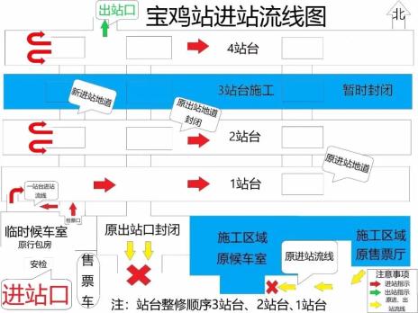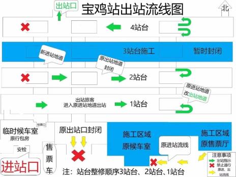 站改期间,宝鸡站在地道、站台等醒目位置设立进出引导牌、地标等引导标识,安排专人进行引导服务。在您乘车期间如遇困难,请及时咨询车站工作人员。