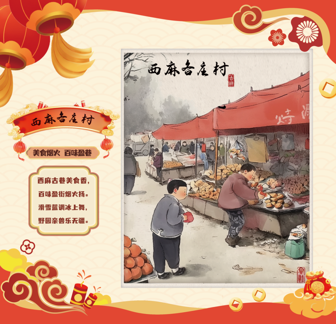 以美食闻名的西麻各庄村,烟火气息中百味盈巷。春节在西麻各庄村,您可以体验复古风情与冰雪运动的双重乐趣,古色古香的牌楼,历史悠久的街道,还有采用仿古式设计的民居、公园、永定河流域文化展馆等。漫步村中,您可以细细品味那些雕梁画栋、青砖灰瓦间透露出的历史沧桑与文化底蕴,仿佛穿越时光隧道,每一处细节都在诉说着往昔的故事。