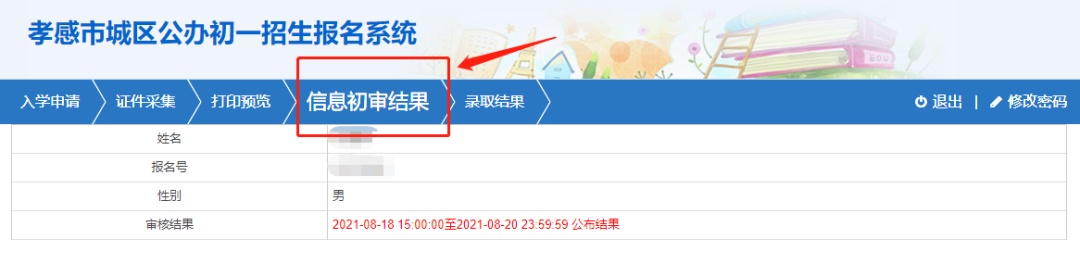 8月18日-20日,各学生家长登录招生平台,查询初审结果。初审不通过的学生,可修改审核资料(每个学生最多只可修改一次资料)。