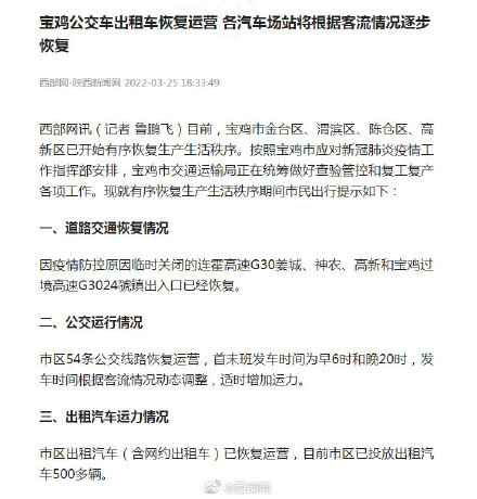 宝鸡公交车出租车恢复运营 各汽车场站将根据客流情况逐步恢复