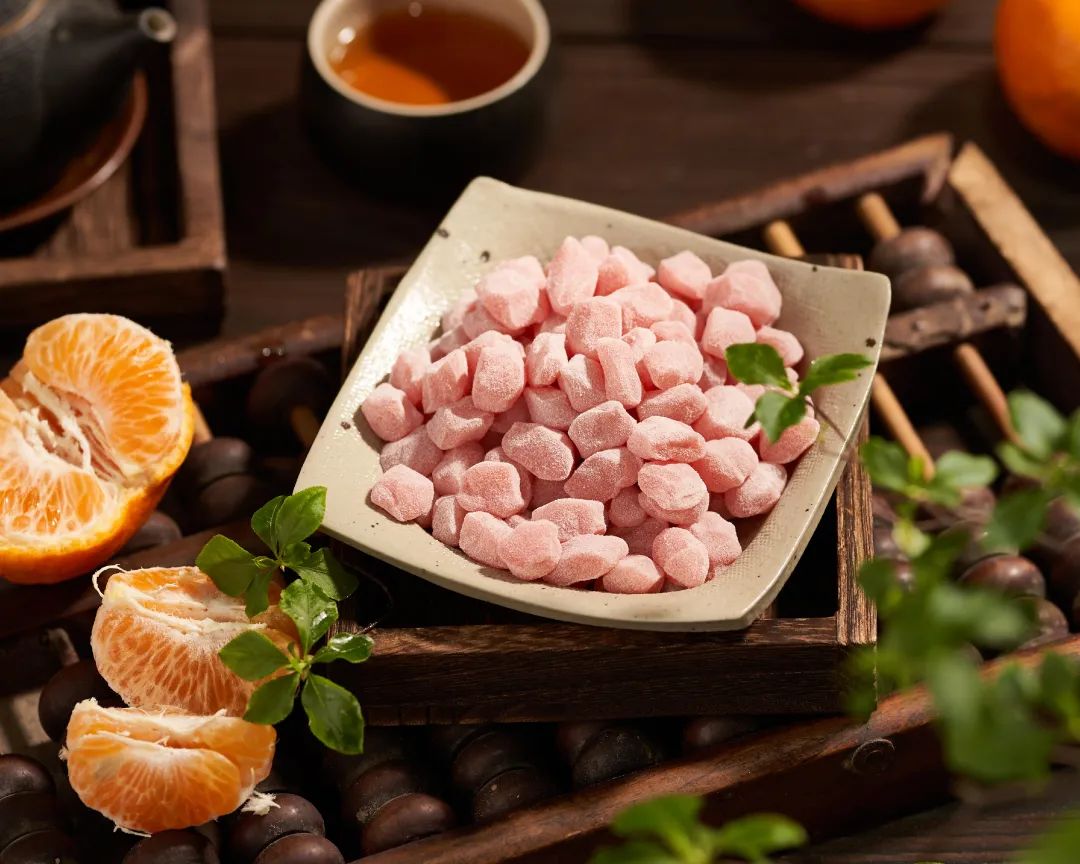 我对苏州桔红糕的感情如初恋,蔡福的这款桔红糕,色泽温雅,糕体软糯,就像小女孩的洁滑肌肤。师傅以水磨糯米粉为材料,用红曲粉水染成浅红色,搓条切段后滚粉,糯滑适口,甜不腻味。又因为糕体中镶嵌着一颗颗幼细的金桔皮,在口中咀嚼时有果香萦绕于舌尖。季总说:即使存放一周,依然能保持温软绵糯的质感。