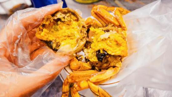 9.9一只的卤蟹比手掌还大,揭盖后满目金黄,蟹黄跟蟹肉几乎一比一的比例。一口下去,蟹黄和鲜甜的蟹肉伴着老板的秘制卤料在嘴里开花。