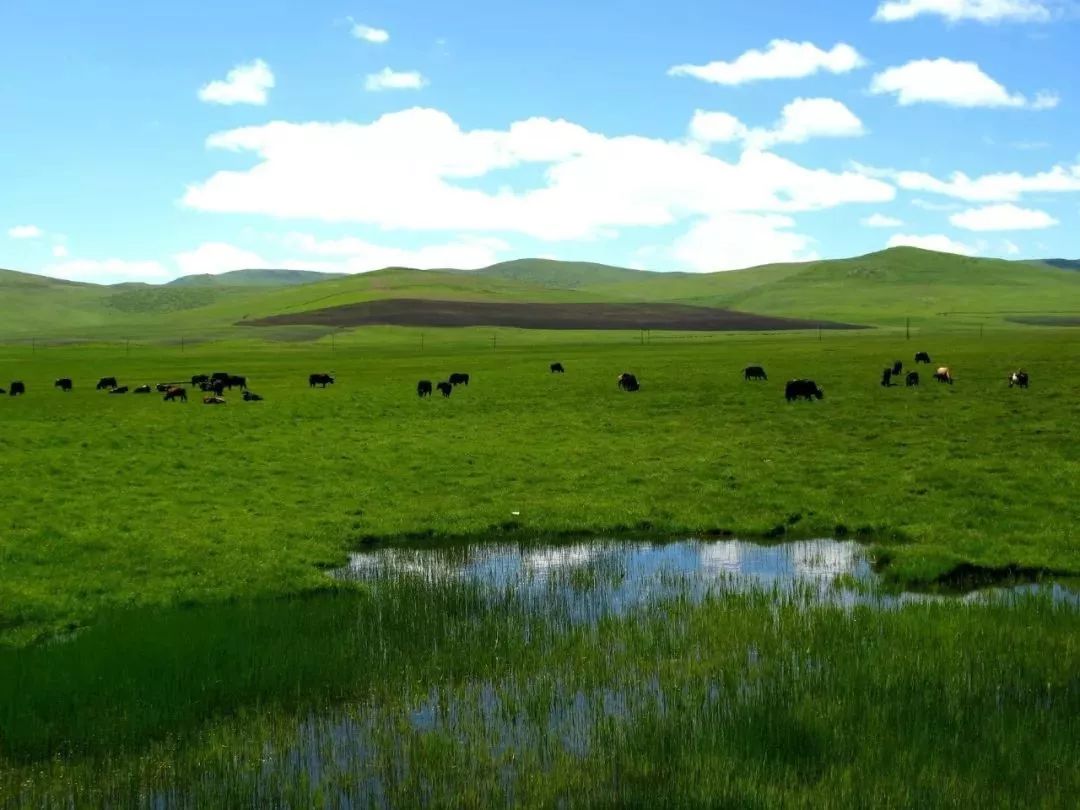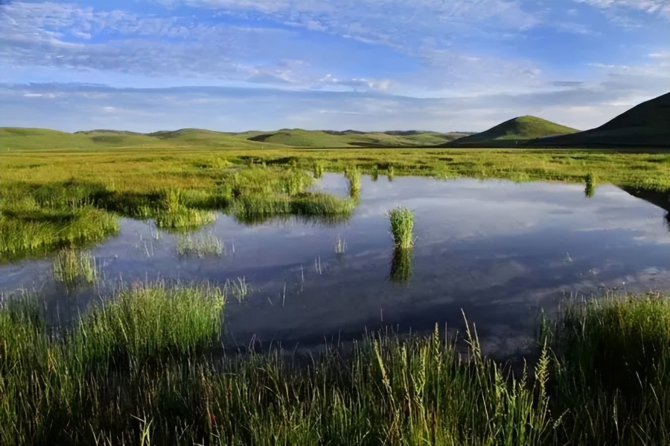 狼渡湿地草原呈平原丘陵地貌,平均海拔2600米,气候凉爽宜人,境内山体浑圆,地势平坦开阔,河流纵横,草原广阔,水清草绿,空气清新,蓝天白云,水天一色,是消夏、避暑的好去处。