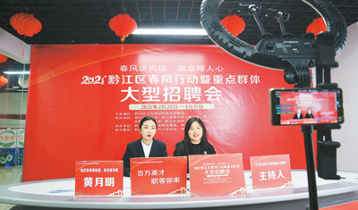 2月10日,在江苏省南通市人力资源大厦“云就业”直播招聘平台,用人企业工作人员(左)介绍企业信息、招工需求、薪酬待遇等情况。