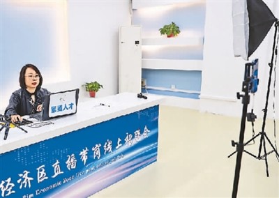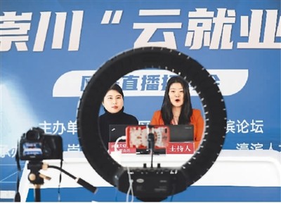 4月19日,在河北省秦皇岛市聚贤人才市场,工作人员使用网络平台进行直播带岗。