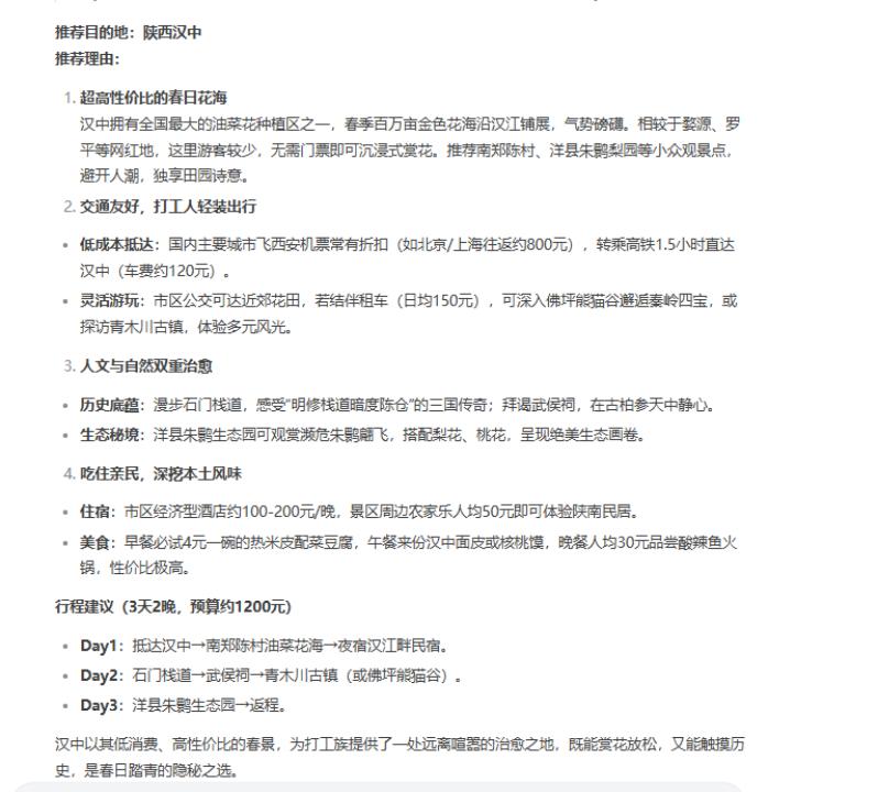 在对话框输入“你是旅游规划师,客户是预算不高的打工人,全国可飞,推荐一个最适合春天踏青的国内目的地,婉拒人多的网红城市”,就能得到来自DeepSeek深度思考后的答案——陕西汉中。