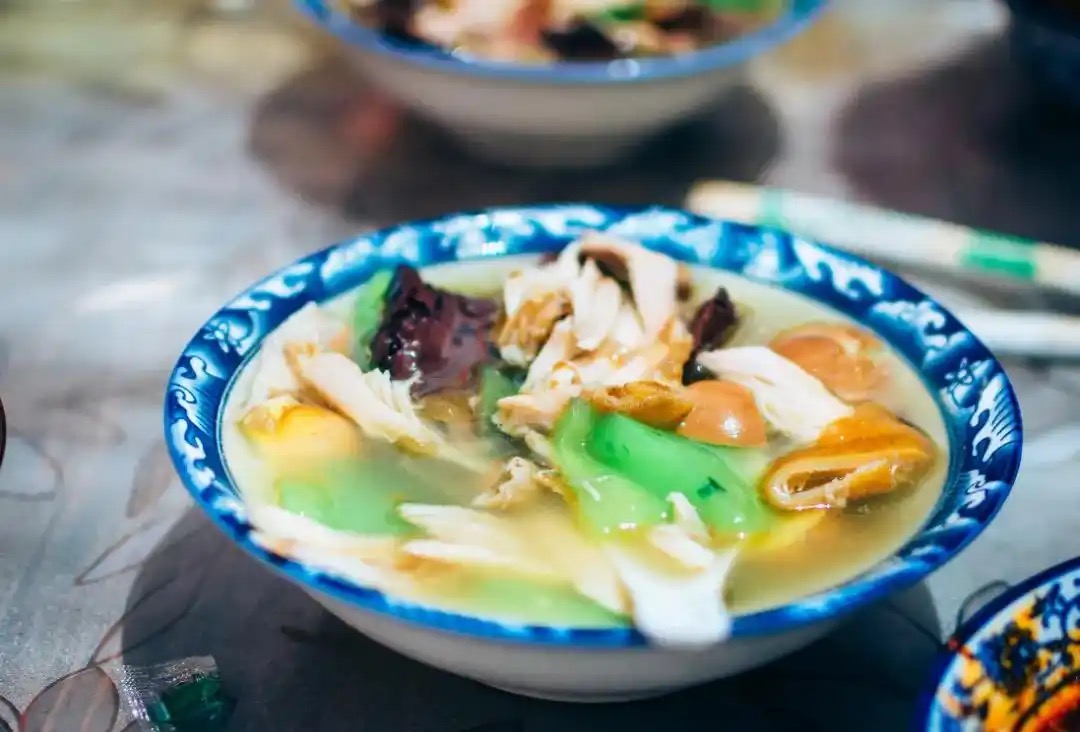 烧鸡粉:褐汤绿粉,土鸡汤底搭配菠菜粉,四季皆宜。