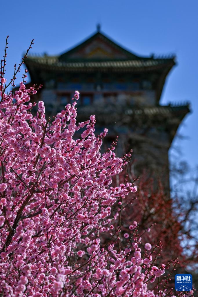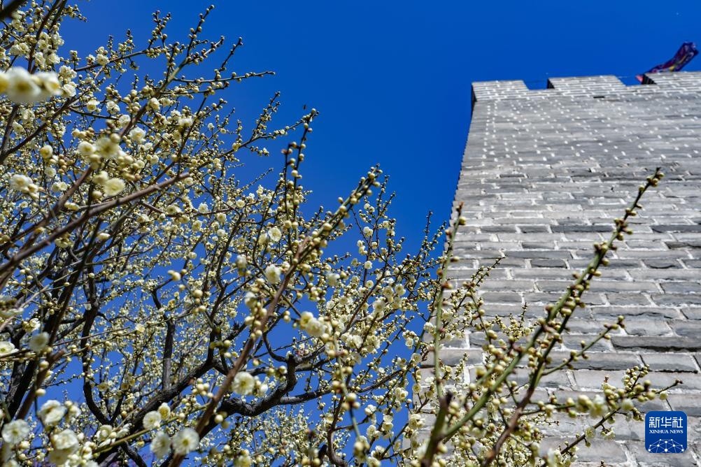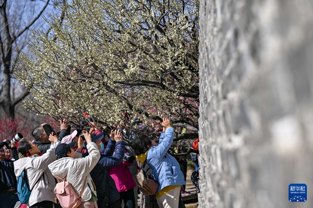 3月12日,人们在北京明城墙遗址公园赏花拍照。