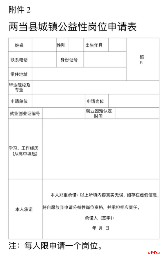2.报名方式:报名人员直接到用人单位咨询报名。(联系电话见招聘表);报名人员请将《两当县城镇公益性岗位申请表》送到人社局410办公室。