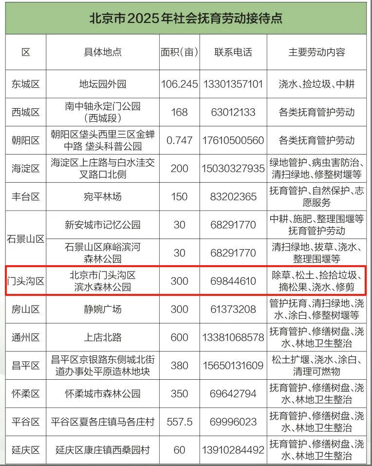 其中,门头沟区社会抚育劳动接待点为滨水森林公园,主要劳动内容包括:除草、松土、捡拾垃圾、摘松果、浇水、修剪。联系电话:69844610。