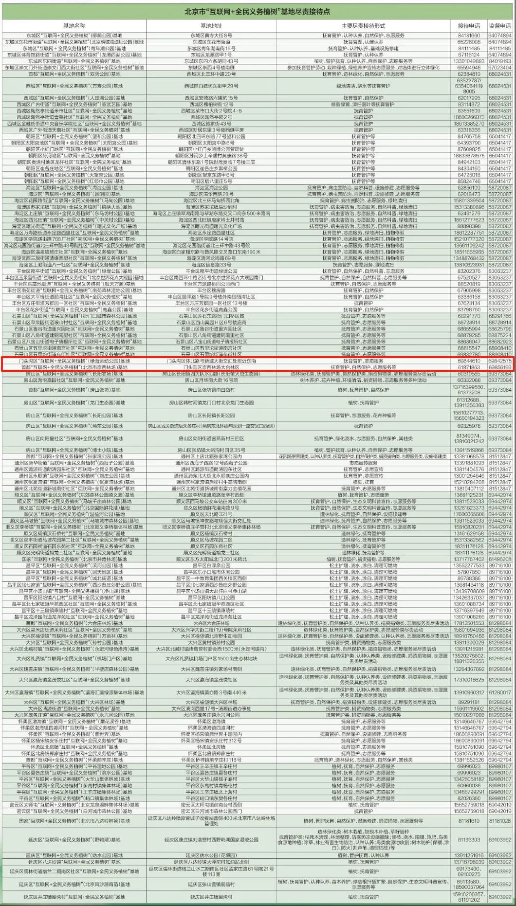门头沟区“互联网+全民义务植树”基地尽责接待点为绿海运动公园,主要尽责接待形式:抚育管护、志愿服务。接待电话:69844610,监督电话:69842575。