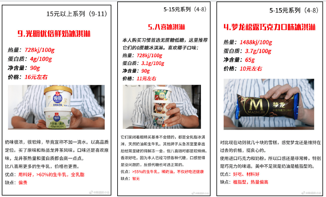 如果大家再有一点探真精神,拿出钟薛高产品的配料表和其他同层次产品进行对比,你会发现钟薛高的热量比别家的产品低,但是蛋白质含量却明显高于其他品牌,有人追求单纯的口腹之欲,就有人追求健康与口腹之欲兼得,一分钱一分货,就是这么个理。